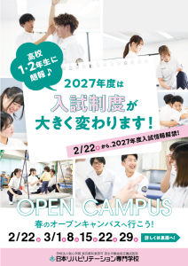 日本リハビリテーション専門学校では、2027年度入学選抜より入試制度が大きく変わります。詳しくは2月22日(日)よりオープンキャンパスなどで説明いたします。