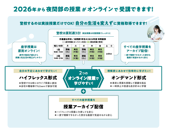 日本リハビリテーション専門学校では、2026年度より夜間部の学び方が大きく変わります。オンライン授業を大幅に取り入れて、「通えないから…」で資格取得をあきらめない学習支援をスタートします。